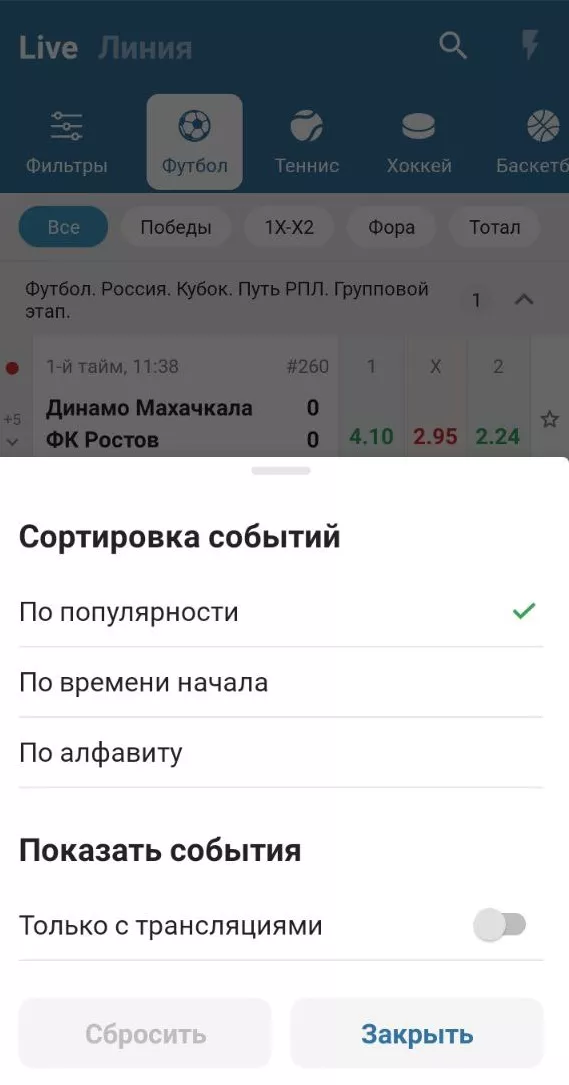 - Кликнуть по иконке и смотреть матч в прямом эфире.