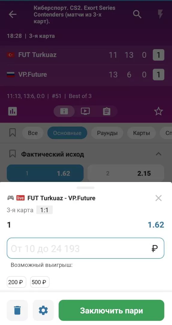 Необходимо добавить в купон выбранное событие, коэффициент, указать сумму и нажать кнопку “Заключить пари”.