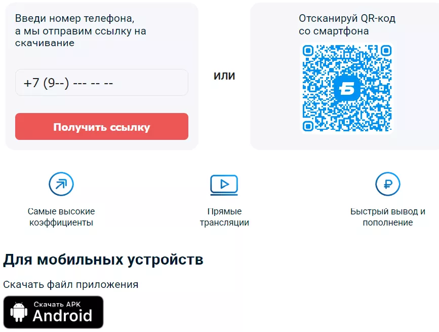 Зайти на сайт БК в раздел Приложения. Ввести номер телефона и получить ссылку для скачивания по СМС. Отсканировать куар-код или нажать на кнопку загрузки.