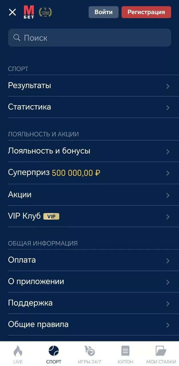 После регистрации пользователь получает доступ ко всем функциям Marathonbet. Главные разделы приложения расположены в нижнем меню. Для быстрого перехода к событию достаточно выбрать вид спорта или воспользоваться поиском.
