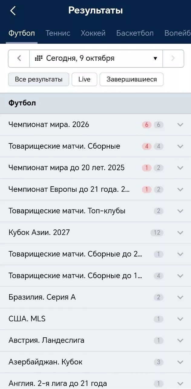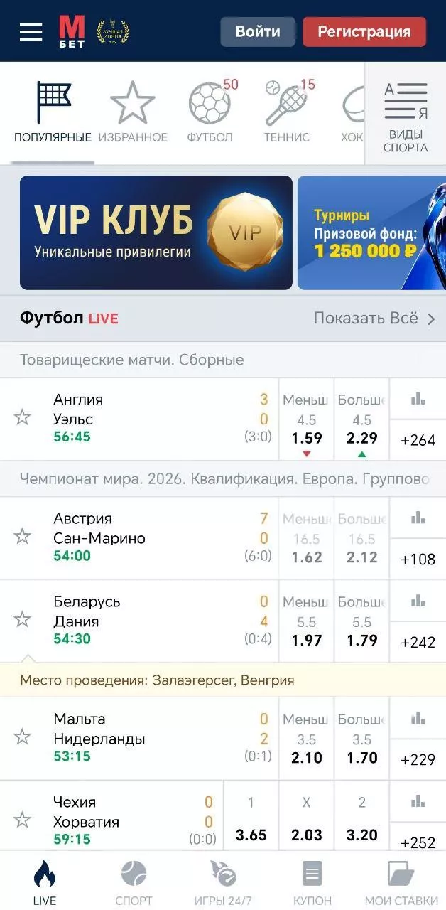 В разделе «Live» отображаются события, доступные для просмотра в прямом эфире. Матчи с трансляциями помечены специальной иконкой. Для доступа необходимо войти в аккаунт и иметь положительный баланс.