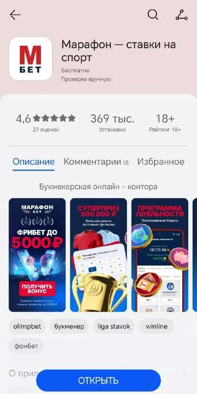 - AppGallery (Huawei) — доступ по прямой ссылке с сайта Marathonbet. При переходе с Huawei-смартфонов автоматически открывается карточка приложения. Доступность зависит от региона и типа учетной записи.