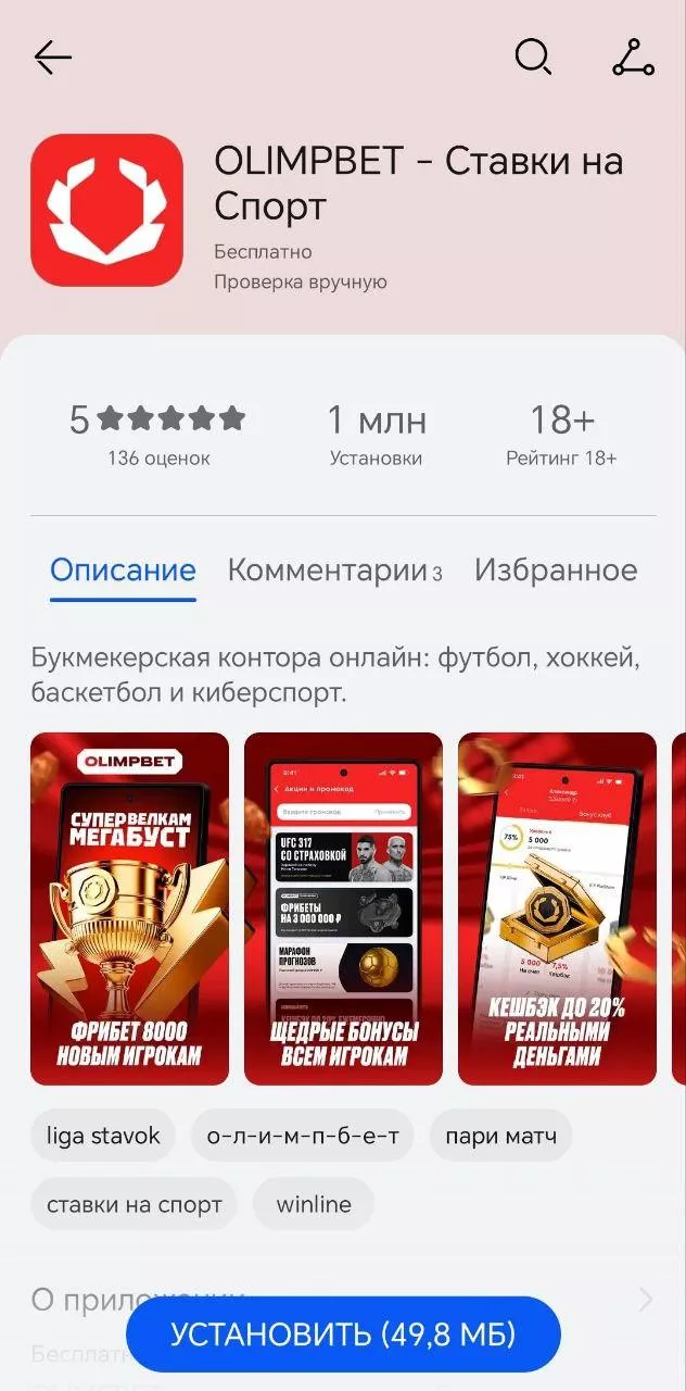 Приложение OLIMPBET доступно в AppGallery. Карточка открывается через ссылку с официального сайта. В зависимости от региона видимость может отличаться, но установка выполняется стандартно: нажмите «Установить», дождитесь загрузки и подтвердите установку.