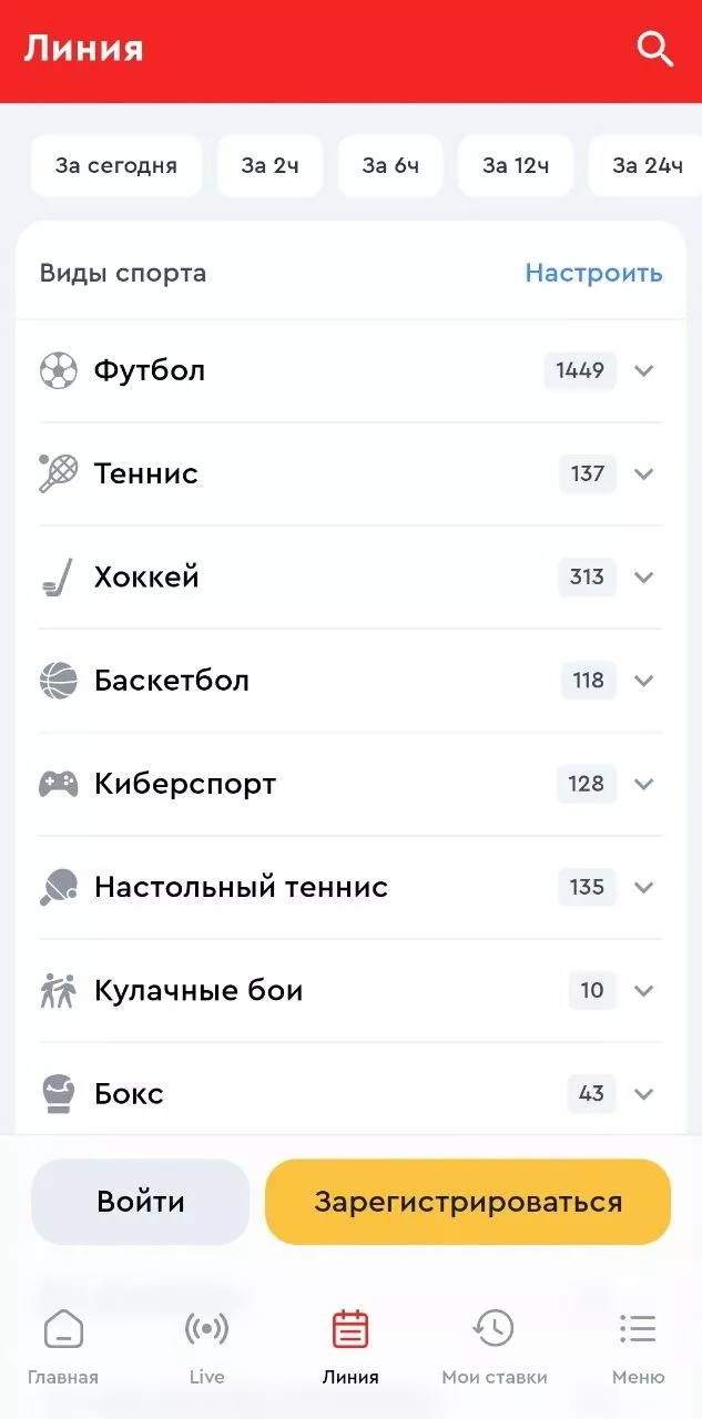 Раздел «Линия» содержит спортивные события, доступные для ставок до начала матчей. Здесь можно выбрать вид спорта, открыть подробную роспись и добавить исход в купон.