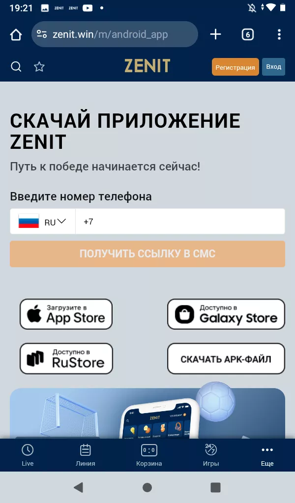 - Регистрация и вход через приложение БК Зенит