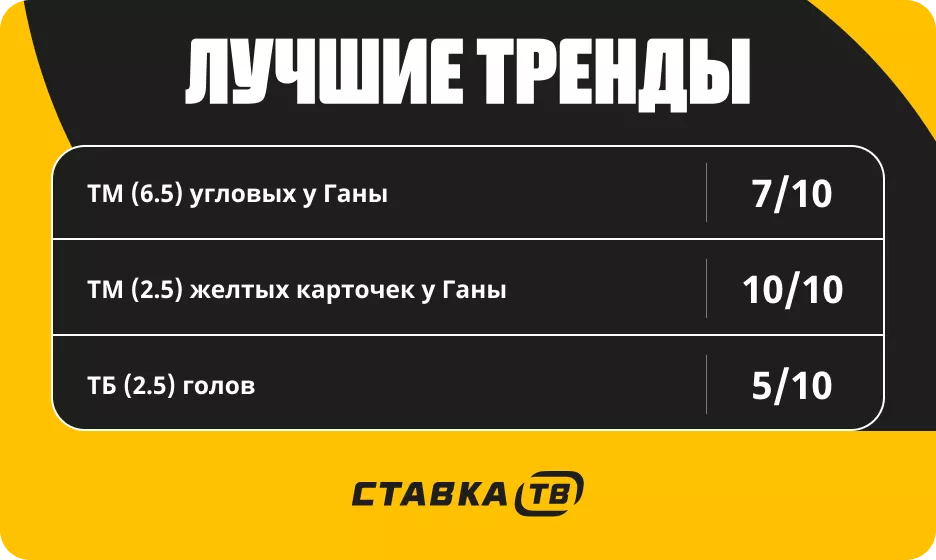 - ТМ (2.5) желтых карточек у Ганы – 10/10