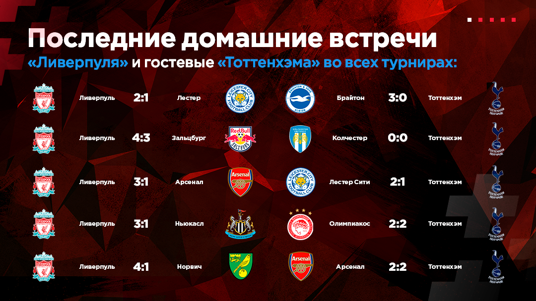 Последние домашние встречи “Ливерпуля” и гостевые “Тоттенхэма” во всех турнирах: