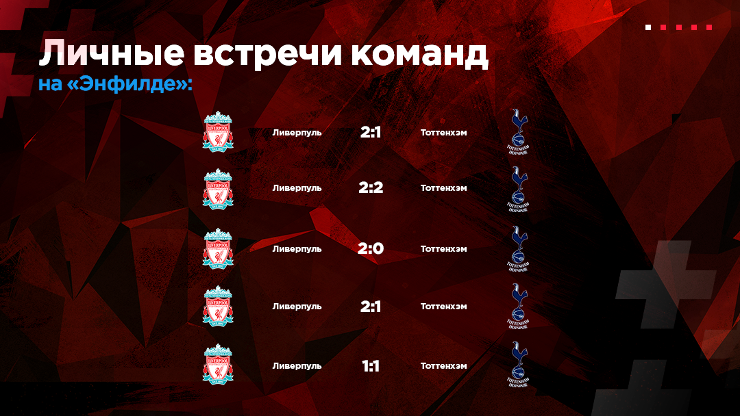 Три победы “красных” и две ничьи. В Ливерпуле “Тоттенхэм” не выигрывал с 2011 года. В четырех из этих пяти игр оба коллектива забивали.