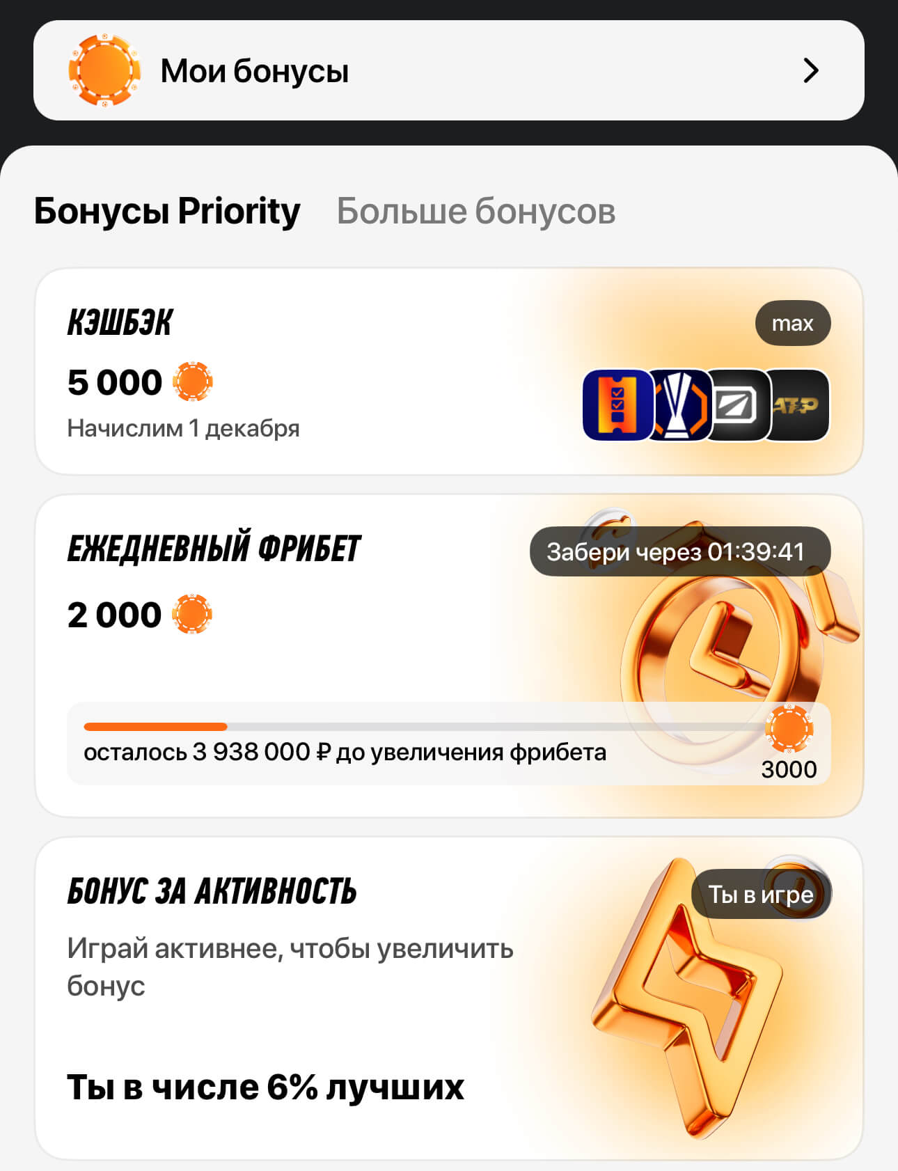 Ежедневный фрибет — 2000 рублей, начисляется по классике. Ровно в 12:00 по МСК смогу забрать очередные 2000 рублей.