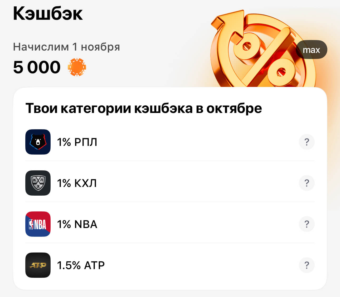 В-третьих, кэшбэк по категориям — выбили максималку на 5000 рублей, начислят 1 ноября. Ждём.