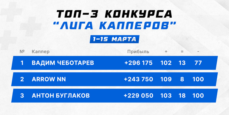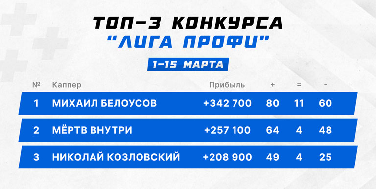 Если в "Лиге капперов" были намеки на борьбу за пьедестал почета в последние дни, то победитель "Лиги профи" был определен еще несколько дней назад. 342 700 рублей чистыми — думаете, кому-то удалось подобраться к такому результату? Михаил Белоусов поставил жирную точку в этом вопросе еще 12-го марта. За оставшееся время никому не удалось подойти близко к его результату, хотя показатели главных преследователей тоже блестящие.