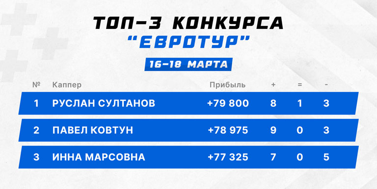 Нашелся в числе призеров один человек с нулем в графе поражений. Хотя нужно отметить, что Александр Кряжев совершил только три прогноза, но зато каких! Три точных выстрела на Лигу чемпионов, средний кэф 3.52 и 56 700 чистыми.