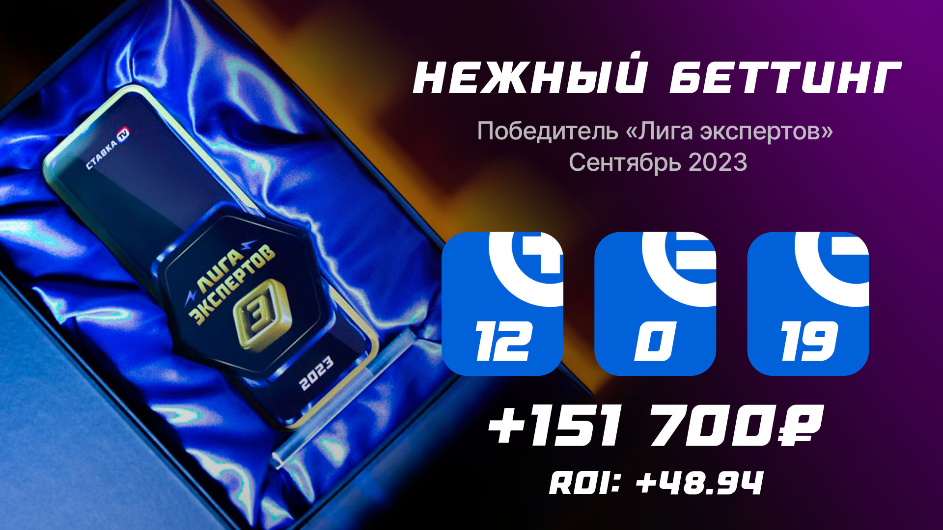 “Нежный беттинг” стреляет редко, но очень метко: до победы в этом сентябрьском розыгрыше он попадал в призы “Лиги экспертов” только раз — когда выиграл конкурс в октябре прошлого года. Дважды в призах — дважды первый. В активе нашего победителя ROI +48.94%.