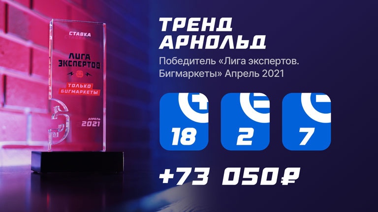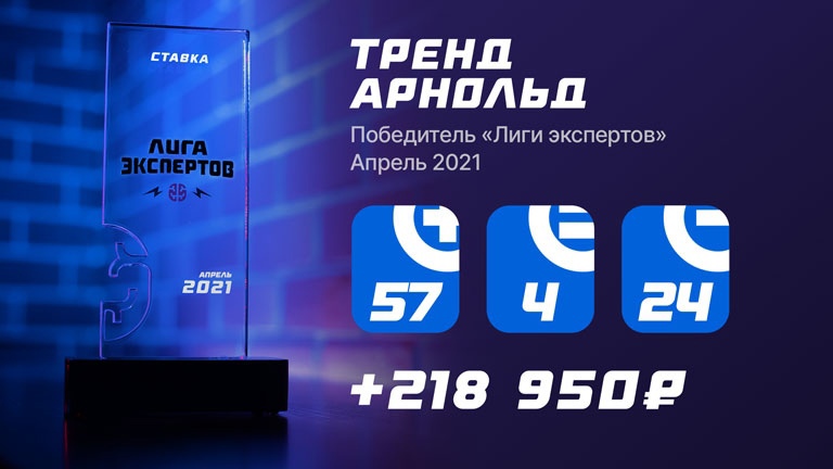 Настало время назвать имя сильнейшего прогнозиста апреля. Ох, как же он упорно шел к своей цели. Тренд Арнольд обошел всех участников "Лиги экспертов" в этом сезоне сразу в двух таблицах и сделал золотой дубль. И это, внимание, уникальное достижение на данный момент!