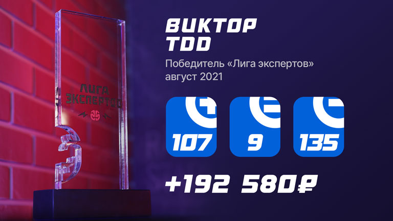 А победителем "Лиги экспертов" в августе стал Виктор TDD. Он триумфально ворвался в ряды обладателей трофея, пройдя за два месяца путь от дебютанта до чемпиона. Да, именно Виктор победил в июльском турнире в рамках "Второго дивизиона", а уже сегодня к нему отправляется кубок основной "Лиги экспертов". Наши поздравления!