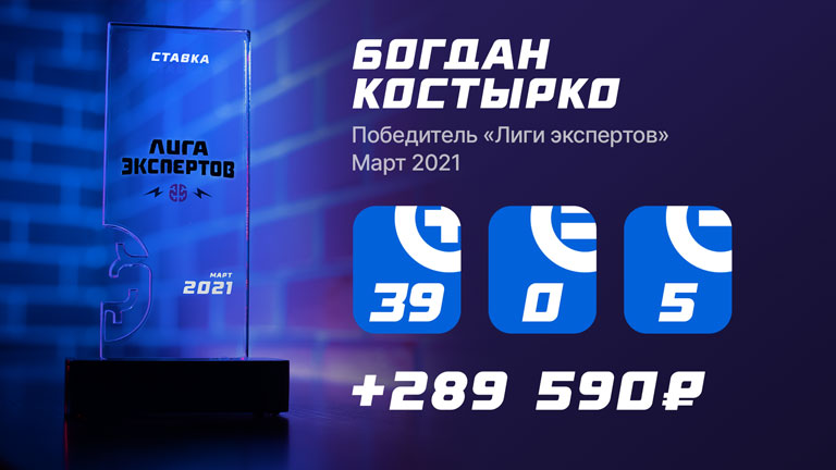 Сказать это мы должны были обязательно. Теперь можно спокойно констатировать: Богдан Костырко — победитель "Лиги экспертов" проекта СТАВКА в марте. Он забирает главный приз конкурса и красавец Кубок, который, как вы знаете, для него уже не первый. Богдан — трехкратный чемпион!