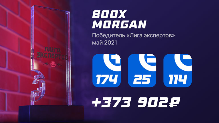 Победителем "Лиги экспертов" в мае становится Boox Morgan! Он прошел долгий путь от простого каппера до эксперта; заявил о себе в качестве рекордсмена проекта по прибыли за все время, ведь шутка ли, но у него больше двух миллионов чистыми с марта 2019-го года. Кубок победителя — это жирная точка на триумфальном пути и пример для многих других пользователей сайта!