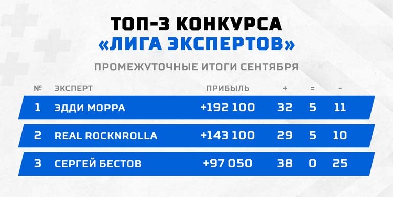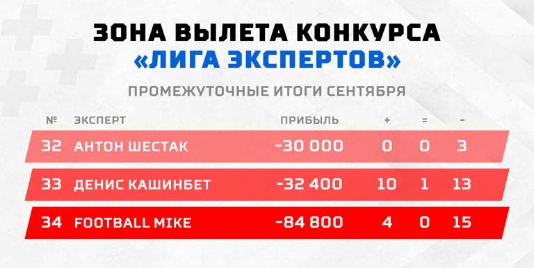Сейчас в опасной близости от пропасти уже нет любителей киберспорта и хоккея, а три последние строчки занимают следующие эксперты: ведущий канала "Два про НБА" на YouTube — Антон Шестак (-30 000); Денис Кашин (-32 400), ставивший исключительно на теннис в сентябре, а также Football Mike (-84 800), чья позиция кажется настоящим безумием, ведь он завершил прошлый месяц на восьмой строчке в таблице с большим плюсом.