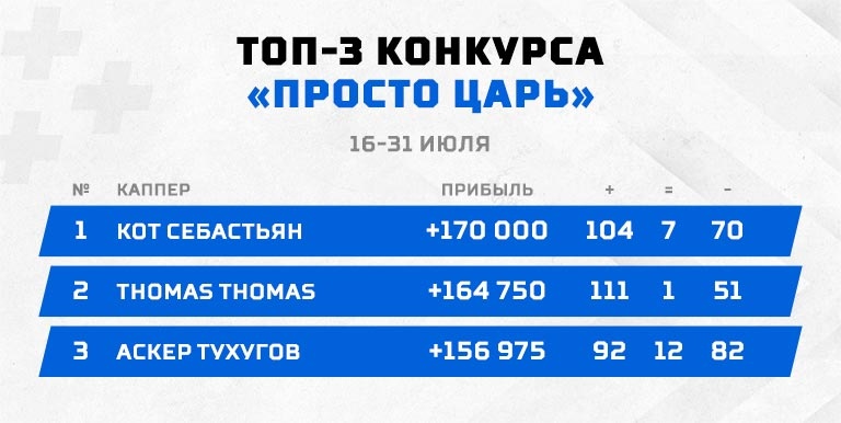Что ж, вернулся в призеры Андрей Егоров и уже обещает забрать все турниры в августе; 18 из 20-ти мест застолбили за собой капперы, позволив войти в топ только двум профи, а точнее всех среди простых смертных стрелял в этот раз бразилец David Luiz. Его винрейт остановился на отметке 68,57% побед!