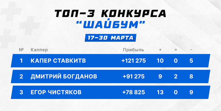 Хотя конкурс "ШайБум" длился 14 календарных дней, по количеству возможных событий его нельзя назвать долгим, скорее — средним. И в этих условиях счетчик винрейта будет не столь показательным, но мы все же должны отметить каппера, который был самым точным в конкурсе: Станислав Лисянин показал результат 10-0-2, что равняется 83.3% точных заходов.