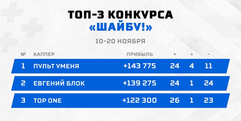 Лидер ноябрьской "Лиги экспертов" — Валерий Тумаш — тоже залетел в число призеров конкурса "Шайбу!", с чем мы его и поздравляем! Именно он показал самый большой процент точных заходов (81,8%) и всего за 11 попыток занял свое место в топ-20.