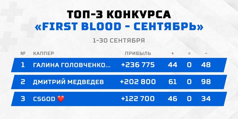 "Fire in the hole!" - эти слова знакомы любому, кто хоть раз рубился в CS:GO. Играть можно не только на интерес. На многими любимую "контру" можно ставить и круто на ней поднимать. Специально для любителей этой великолепной стрелялки мы и запустили конкурс под названием "First Blood". В уже упомянутом нами блоге мы объявили о перераспределении призового фонда не в пользу данного турнира (эти средства пойдут на увеличение призов в других соревнованиях). С октября здесь разыгрываются 25 000 рублей, но в сентябре были все 50 000. Пора подводить итоги!