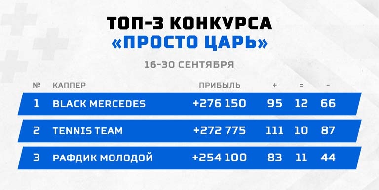 Пока молодежь поет непонятные песни про Cadillac, то победителем нашего конкурса становится пользователь с автомобильным ником black mercedes. Победитель показал себя настоящим универсалом, поднимая кэш на футболе, теннисе, хоккее и баскетболе. Проще перечислить в чем он не разбирается! black mercedes с показателем в 276 150 оказался самым стабильным на дистанции и справедливо взял чемпионский титул. 20 000 рублей призовых уходят к нему. Вот вам и первый взнос на черный мерседес.