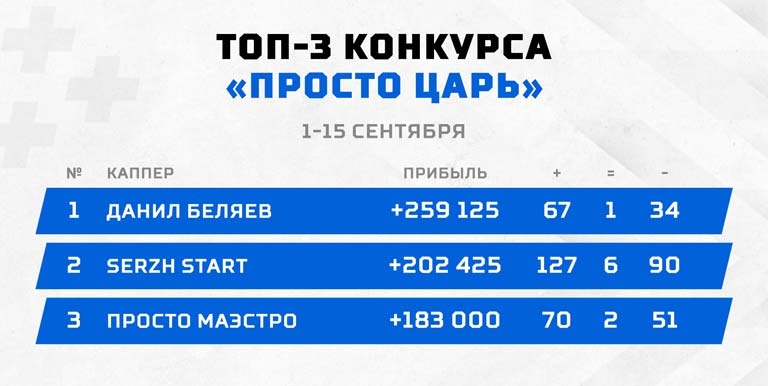 Друзья, начинаем с хороших новостей! Если есть круговорот воды в природе, то почему бы не быть круговороты конкурсов на СТАВКА TV? Если завершается один, то ему на смену приходит другой. Сегодня подведем итоги очередного "Просто Царь", проходившего с 1-го по 15-е сентября (75 000 рублей призовых!). Но перед этим напомним, что уже стартовал новый царский турнир. Правила и призы такие же, а даты - 16-е - 30-е сентября.