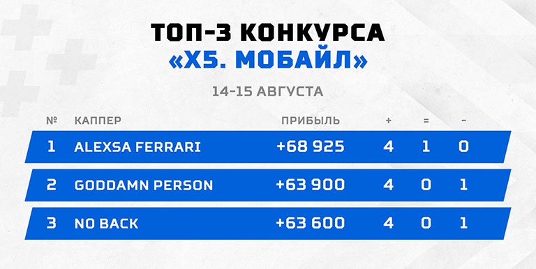 Очевидно, что именно непредсказуемый результат матча "Манчестер Сити" – "Лион" существенно изменил положение дел в лидирующей группе. Третьим счастливчиком стал каппер No Back. Он, как и Goddamn Person, всей душой верил в атакующий потенциал французов, а те не подвели. И хотя No Back сумел взять исход по более высокому коэффициенту, для второго места этого не хватило. На финише двух участников разделили мизерные 300 рублей.