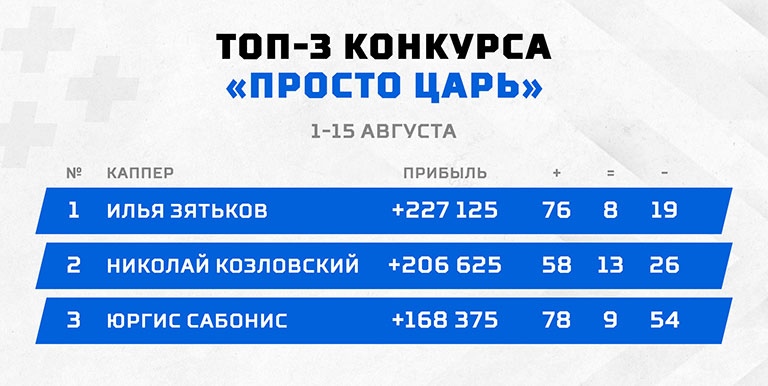 Победителем конкурса "Просто царь" (1-15 августа) стал Илья Зятьков. Друзья, поверьте, этот парень заслужил сегодняшний триумф. Концовка турнира вышла для него на редкость урожайной, поэтому Илья решил не испытывать судьбу, оставив один единственный прогноз на 15-е число. Да и он оказался точным, что довело его общую чистую прибыль в конкурсе до 227 125 рублей. Все это заправлено шикарным винрейтом в пределах 73,78% побед! Прекрасный результат и абсолютно заслуженные 20 000 рублей победителю.