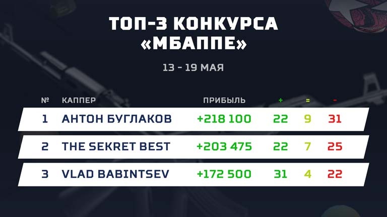 Третью строчку застолбил за собой Влад Бабинцев. Под конец конкурса он поймал неплохую серию из удачных прогнозов, а в последний день и вовсе выдал восемь точных заходов из девяти. Единственная осечка была допущена в матче "Ахал" – "Алтын Асыр". Влад явно недооценил способности многократного чемпиона Туркменистана, но обезопасил себя от посягательств на пьедестал со стороны других пользователей: 172 500 рублей прибыли и почетное третье место.