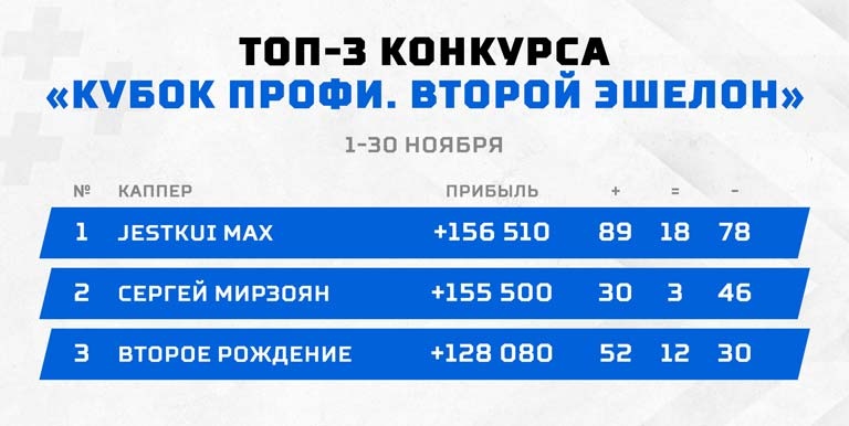 И в этой ночной борьбе верх все-таки взял "Jestkui Max". Мы не можем разделить этих двух пользователей в итогах, потому что судьбу "Кубка профи" решили мизерные 1 010 рублей! Сергей Мирзоян подготовил на самой ленточке три прогноза, но сумел прибавить только 3 600 к своему результату. А вот "Jestkui Max" рисковал гораздо серьезнее, и именно этот риск себя оправдал. 36 900 рублей в плюс за последние семь матчей и долгожданная победа.