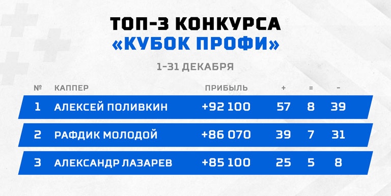 На календаре только 1 января, а в проекте СТАВКА работа уже идет полным ходом. Сегодня будем говорить об очередном "Кубке профи", который подарил нам всем новенького эксперта. Нас очень радует высокий градус борьбы, сохраняемый участниками из розыгрыша в розыгрыш. Помните, какая драматичная развязка выдалась в прошлый раз? Поверьте, в декабре турнир проходил в таком же ключе.