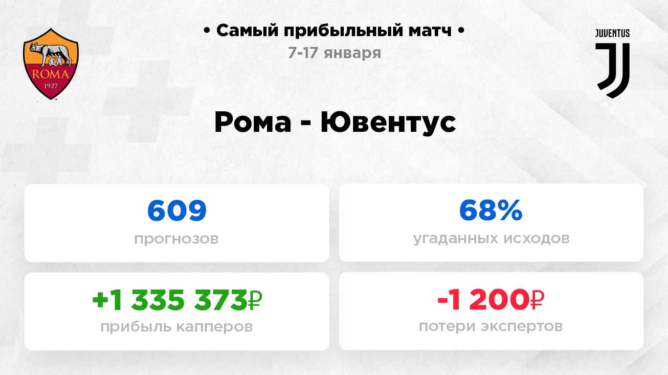 Тем не менее, встречу с "Ромой" назвать легкой прогулкой было нельзя. Более того, "волки" выглядели в конкретно взятой встрече здорово, но очки заработать не сумели. Львиная доля ставок наших пользователей пришлась именно на успех гостей, и они попали в точку. На простую победу "Ювентуса" поставили 263 человека (43,19%), еще 16 выбрали вариант Х2, а добавив к этому списку любителей ставок ТБ 2,5 голов и "обе забьют" — получаем прибыль в размере 1 335 373 рублей. Спасибо, "Ювентус".