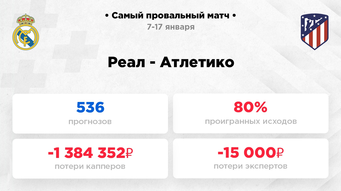 Зинедин Зидан выиграл 100% своих финалов в качестве тренера (9/9), а вот наших капперов подвел. В проекте СТАВКА TV кубковые футбольные поединки рассчитываются с учетом лишь основного времени, а в первые 90 минут была полнейшая тьма. 80% ставок на эту игру оказались проигрышными: здесь и пари на исход в одну и другую сторону, ожидание голов с обеих сторон и, конечно же, любимый всеми тотал больше 2,5 голов. Подумать только! Зидан и Симеоне опустошили кошельки игроков на сумму −1 384 352 рубля и получили звание самых скучных людей января.