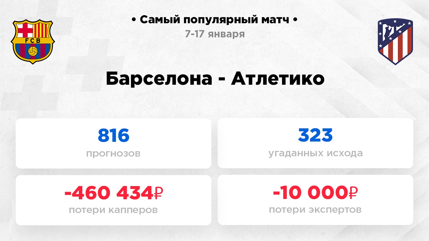 Одно было понятно совершенно точно: зрелище будет прекрасным. Именно поэтому мимо этого матча не смогли пройти 816 человек, наблюдавших за пятиминутным камбэком "матрасников". Огненная победа команды Симеоне разрушила надежды большинства игроков, зарядивших на успех "Барселоны". В минусе оказались все: капперы, профи, эксперты (-460 434 рубля).
