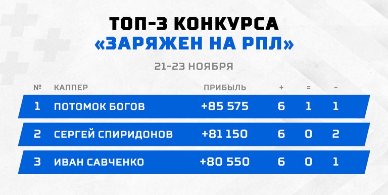 Победителем очередного выпуска "Заряжен на РПЛ" стал каппер с ником "Потомок Богов"! Этот пользователь полностью оправдал свое имя на короткой дистанции, сотворив настоящее чудо на финише. Неудачный старт в первой же игре не выбил его из колеи, ведь далее мы лицезреем серию из семи матчей подряд без поражений, хотя и с одним возвратом. Средний коэффициент успешных заходов 3.06, выверенный решающий выстрел в матче "Уфа" — "Химки" и 85 575 на финише. Без шансов для конкурентов, поздравляем!