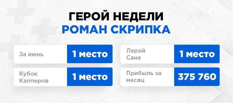 Теперь самое время переходить к... Роману Скрипке. Друзья, этот каппер завершил июнь просто феноменально. Он стал победителем сразу двух конкурсов, а также показал лучший результат за целый месяц среди всех пользователей проекта с чистой прибылью 375 760 рублей.