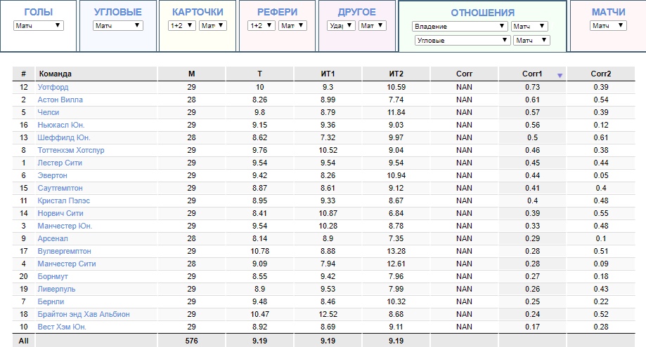 Также можно отметить раздел “отношения”, где отображаются корреляционные зависимости различных статистических данных друг от друга. Большой плюс, что можно выстраивать таблицу по уровню зависимости от большего к меньшему (на скрине ниже, например, видим, что угловые от владения мячом в АПЛ больше всего зависят у "Уотфорда". Значение коэффициента корреляции лежит в пределах [-1;1]. Т.е. 0 – это никакой зависимости, 0.8 – огромная зависимость, -0.3 – отрицательная зависимость). Минус в том, что я только при написании материала понял, что это раздел корреляций. Ничего толком не объяснено и конкретно этот параметр лучше проработан у ресурса Football Betting Helper, с пояснениями и более приятным видом, но вот оказывается и корнерстатс таким располагает.