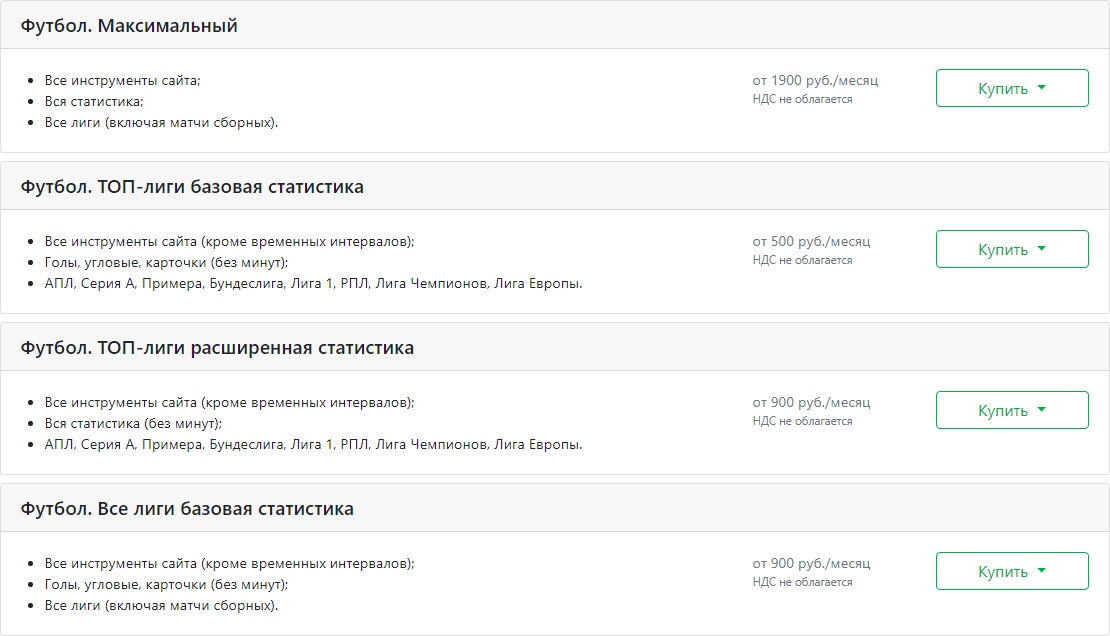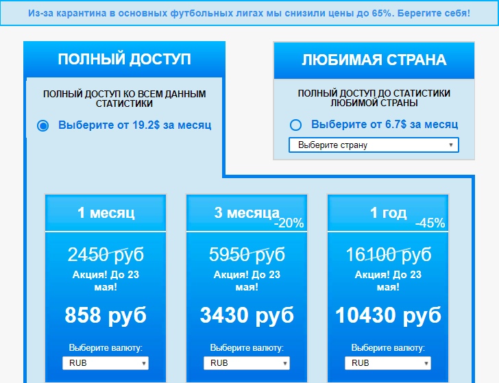 Когда-то на корнерстатс можно было пользоваться лайфхаком с пробным доступом на три дня, просто создавая аккаунты на новую почту. Сейчас этот способ все еще актуален, но бесплатный доступ сайт дает только для одного конкретного чемпионата, который вы выберите, так что тут возни уже больше будет, чем пользы. Сами цены же здесь довольно высокие и до карантина месяц пользования стоил 35 долларов. В настоящий момент сервис предоставляет скидку в 65%, стоит оно того или нет – смотрите сами.