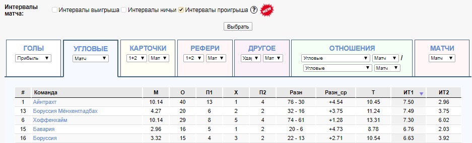 Первое оригинальное решение, которое можно отметить – статистика команд в интервалах выигрыша, проигрыша и ничьи. Т.е. сайт умеет фильтровать статистику на отрезки матча, когда команда вела или наоборот уступала в счете. Это может быть весьма полезно в лайве. Вот, например, у нас был материал с подборкой команд, которые подают угловые лучше всех в Европе, когда им необходимо отыгрываться. На фоне стандартных трендов, которые сейчас публикуют все вокруг, такая информация выглядит интересно и свежо. Ну и по моему опыту в лайве действительно ощущался определенный перевес над букмекером при ставках на угловые заранее отобранных команд. Тот материал хорошо приняли, и мы делали еще одну похожую подборку, но уже не только по угловым, таким образом можно смотреть зависимость и других статистических показателей.
