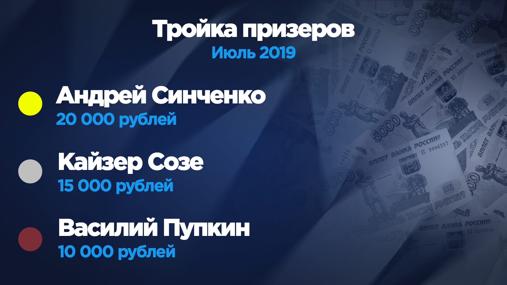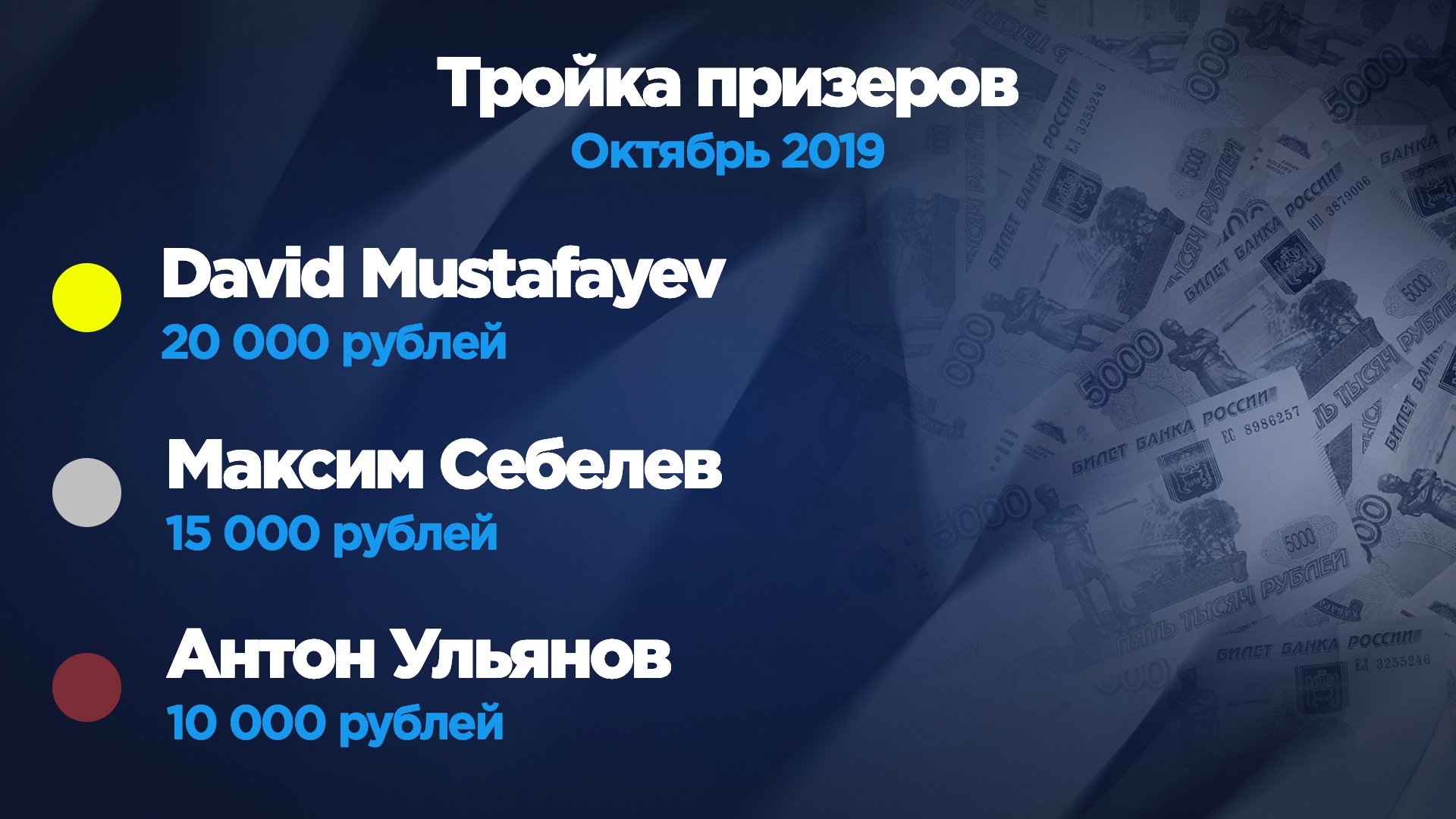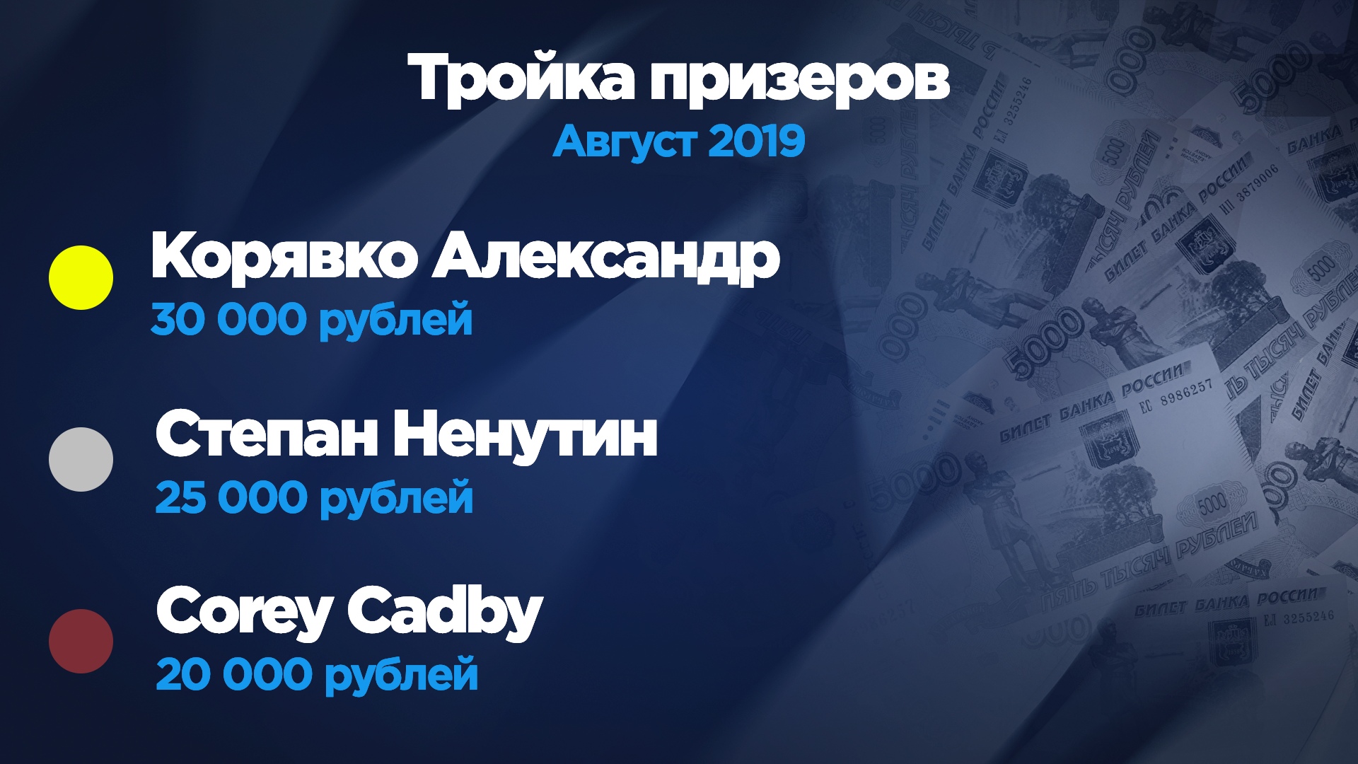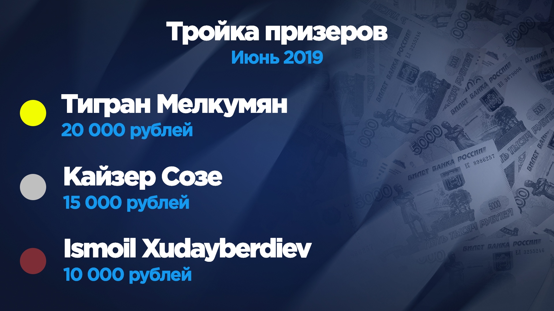 Так уж сложилось, что многие победители конкурсов, как ежемесячных, так и спринтерских, быстро теряют мотивацию, не сумев повторить своих успехов в дальнейшем. Подобная судьба и у Тиграна Мелкумяна. По итогам первого летнего месяца именно он забрал 20 000 рублей — настоящий красавчик! Но отсутствие хороших результатов в дальнейшем подавило желание чемпиона вести игру. В начале ноября он попробовал свои силы в рамках очередного раунда "Евротура", а затем пропал с радаров окончательно.