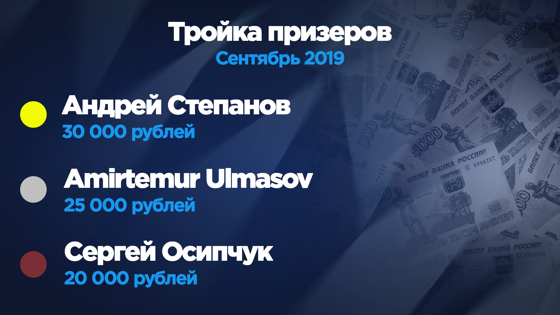 В сентябре капперов СТАВКА TV в очередной раз ждал увеличенный призовой фонд в размере 200 000 рублей, а победу в конкурсе праздновал Андрей Степанов. Чтобы одержать крупную победу в проекте, нашему герою потребовалось шесть месяцев. Как утверждает он сам, его конек — это поединки ведущих футбольных первенств Европы, а также РПЛ. Андрей имеет положительный баланс за все время нахождения в проекте (131 800), ведет свой Telegram канал и продолжает оставаться в наших рядах в статусе "Профи".