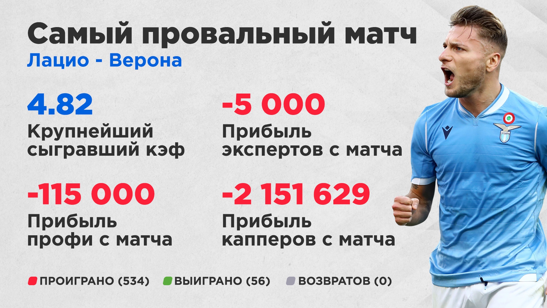 90.51% ставок на эту игру пролетели мимо; не зафиксировано ни единого возврата; ни единой победы "Профи" или "Экспертов"; 20.34% прогнозов на чистую победу "Лацио", 31.36% ставок на триумф римской команды с учетом форы, 11.69% прогнозов на верховой матч; −2 151 629 рублей. С этим придется как-то жить.
