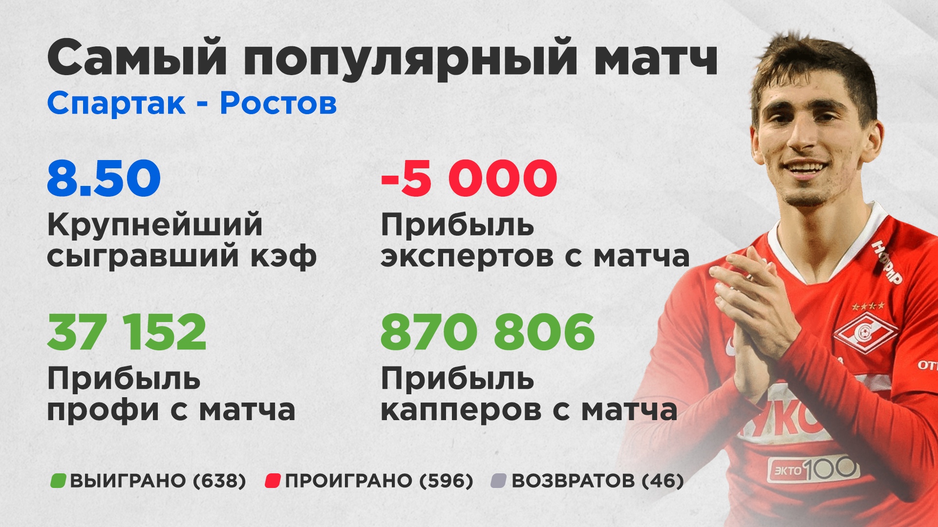 Позиционные атаки "Ростова" на этот раз работали плохо, а свой единственный мяч подопечные Валерия Карпина провели после розыгрыша стандарта. Это позволило воплотить в жизнь идеи капперов, прогнозировавших результативный футбол. Мы насчитали 291 ставку (22.73%) на "тотал больше". Интересно, что в отличие от поединка между "Локомотивом" и "Партизаном", на котором капперы потеряли −802 466 рублей, здесь разбор был проведен на высшем уровне. В итоге получили 638 (49.84%) верно спрогнозированных исходов, а также прибыль в размере 870 806 рублей. Но самое главное — рекордные 1 280 ставок!