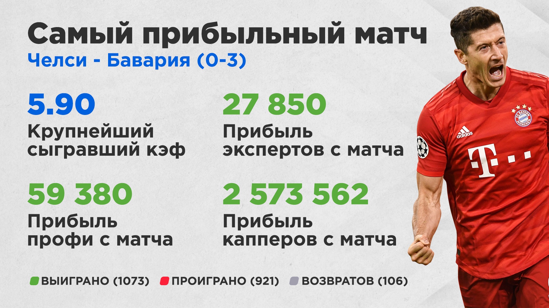 Точными оказались и прогнозы Виктора Гусева (ТБ 2,5), Романа Гутцайта (П2 + ТМ 4,5), Сергея Кривохарченко (X2 + ТБ 2,5), Дмитрия Егорова (П2) и Отара Кушанашвили (Ф2 −1,5), который, как вы знаете, лично основал мюнхенскую "Баварию". Кстати, поздравляем болельщиков этого великого клуба со 120-летием. 51.1% точных прогнозов позволил капперам заработать 2 573 562 рубля. Это рекорд недели.