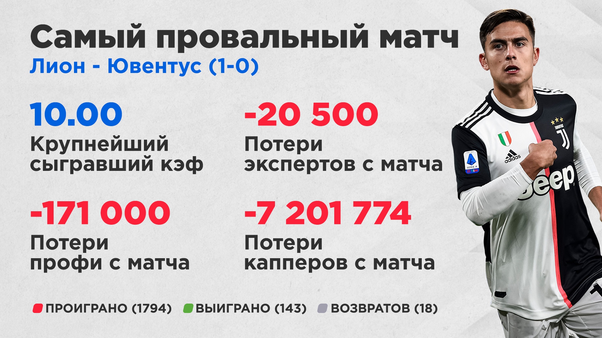 Очень многие ждали гола от Роналду, да и в целом более результативного футбола, но здесь сыграло правило: одни не хотят, другие — не могут. 1 955 прогнозов на данный матч, 91.76% ставок оказались провальными, потери от игры составили невероятные −7 201 774 рубля и, внимание, только две ставки на чистую победу подопечных Руди Гарсии. Самыми смелыми оказались капперы Андрей Субайкин и Арман Ахмедиев. Снимаем перед вами шляпу, господа.