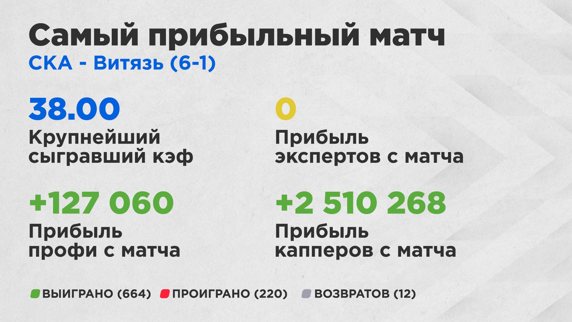 Разница в классе между СКА и "Витязем" отпугнула наших капперов, ведь поединок не смог дотянуть до отметки 1 000 прогнозов (896), однако здесь все было компенсировано снайперской точностью: 74.11% верных исходов. Как вам такое?