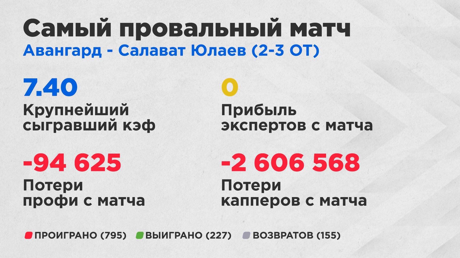 Для сравнения, победу "Салавата Юлаева" в основное время выбрали только 24 человека, а еще 15 доверились шестому чувству, загрузив кровные на ничейный исход. Последние в этот вечер пили шампанское, ведь хоккейные поединки в нашем проекте рассчитываются без учета дополнительного времени. Кстати, над изменением этого пункта мы думаем, а пока возвращаемся к сухой статистике: 1 117 прогнозов, 795 провальных (67.54%) и потери в размере −2 606 568 рублей.