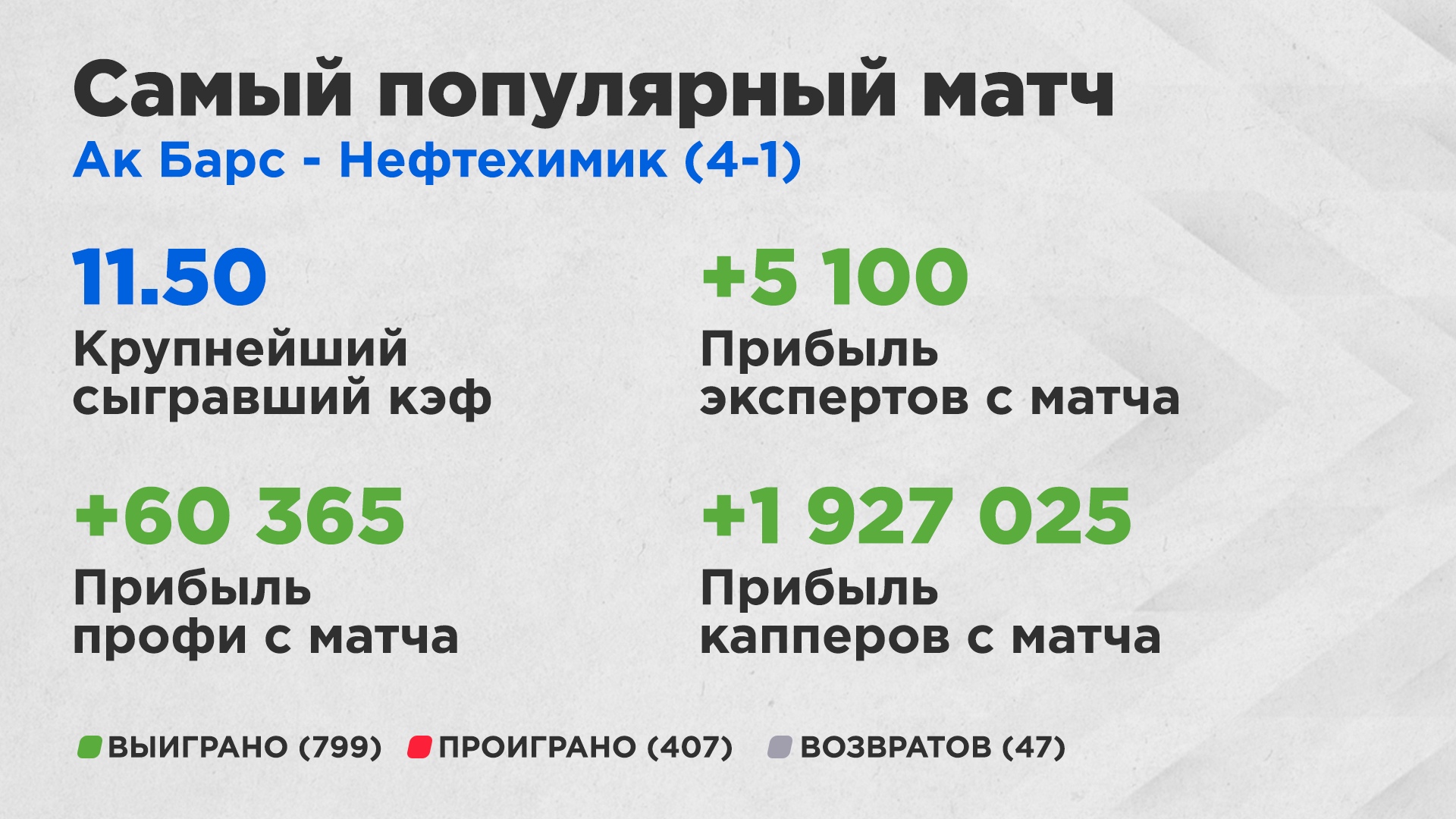 Счет 4-1 обеспечил комфортные условия для захода ставок на чистую победу "Ак Барса", минусовые форы и тоталы. Но самый главный показатель этого поединка — это интерес со стороны пользователей сайта. Звание самого популярного матча прошедшей недели досталось ребятам из Казани и Нижнекамска ценой 1 253-х прогнозов. Кстати, здесь есть и солидная прибыль в размере 1 927 025 рублей